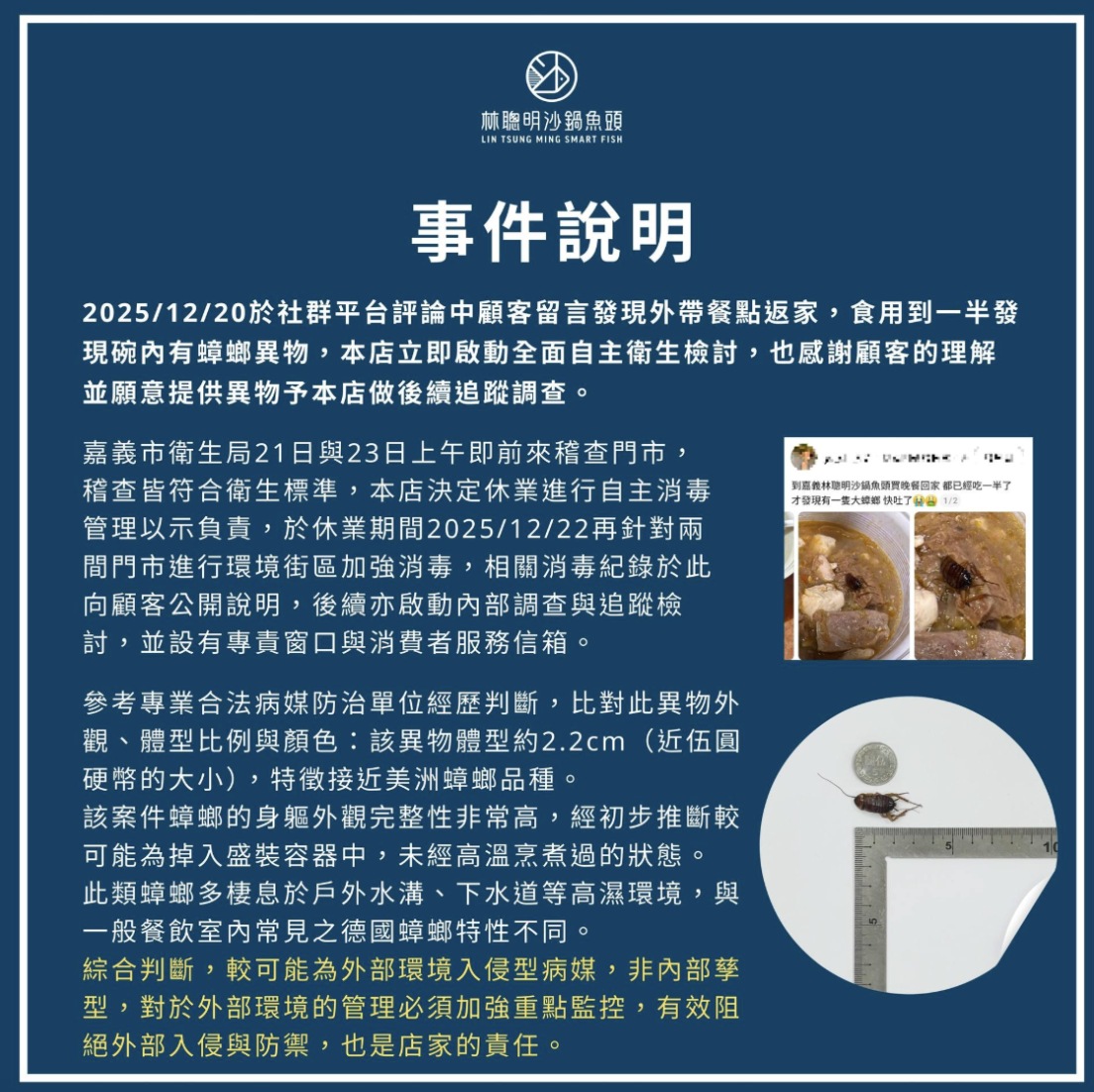 對外清楚說明,也能傳達出品牌對於現況已有十足的掌控,例如林聰明在聲明中提到衛生局兩次稽查、休業期加強消毒、甚至是蟑螂品種及綜合判斷,都讓外界對於林聰明掌控能力,往「穩定」的方向發展。