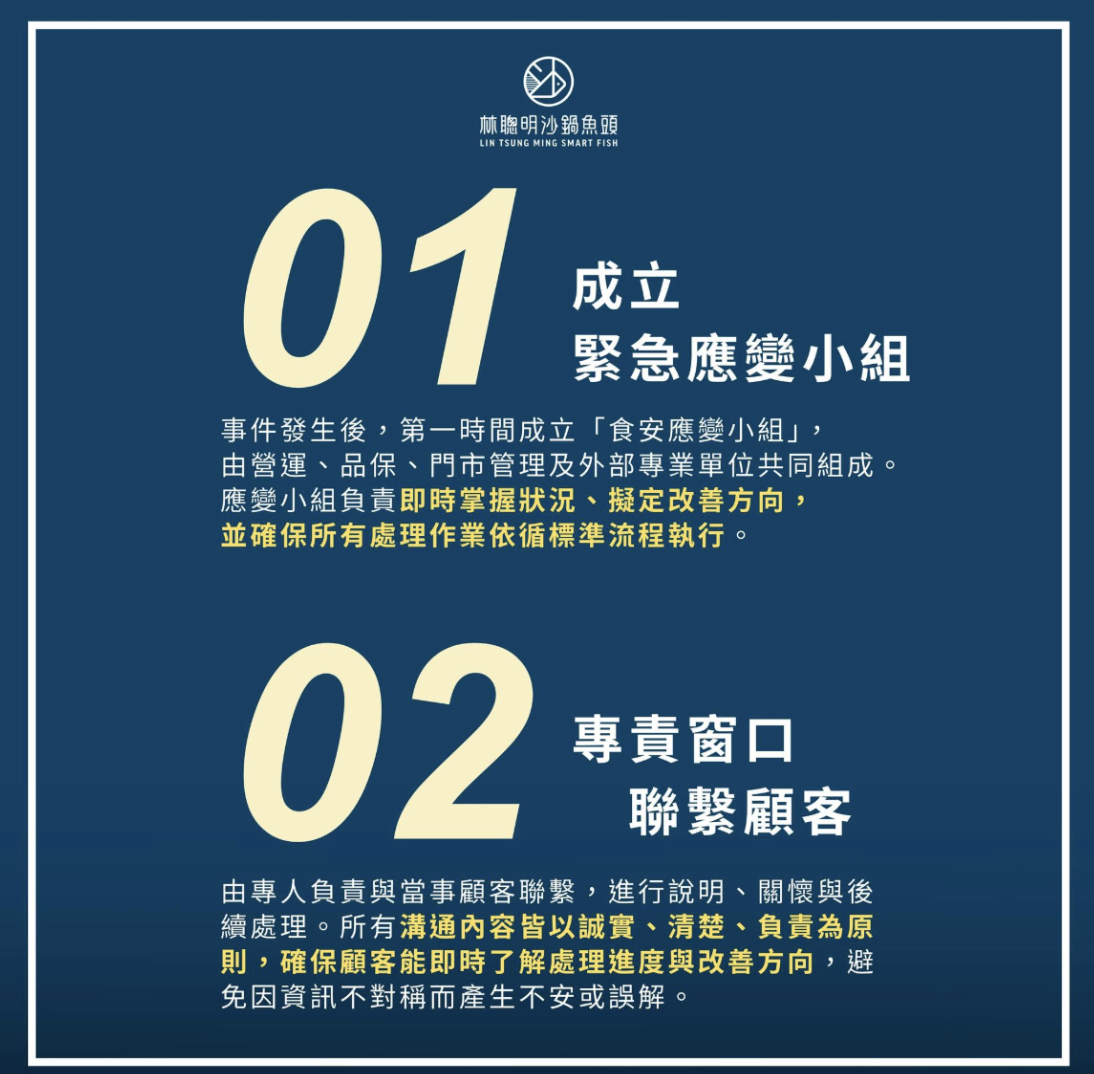 例如,事發隔日 12 月 21 日林聰明品牌 Threads上第一時間回應,說明做了什麼、後續改善作為、點到核心價值;12 月 27 日的社群貼文,用懶人包圖文方式說明目前的進度,近期衛生消毒紀錄和日常作業落實,以可視化、容易理解的方式進行溝通,取得信任;12 月30 日執行長林佳慧的影音聲明,做到逐步且有節點的即時回應,讓社會大眾感受到品牌的「速度與誠意」。