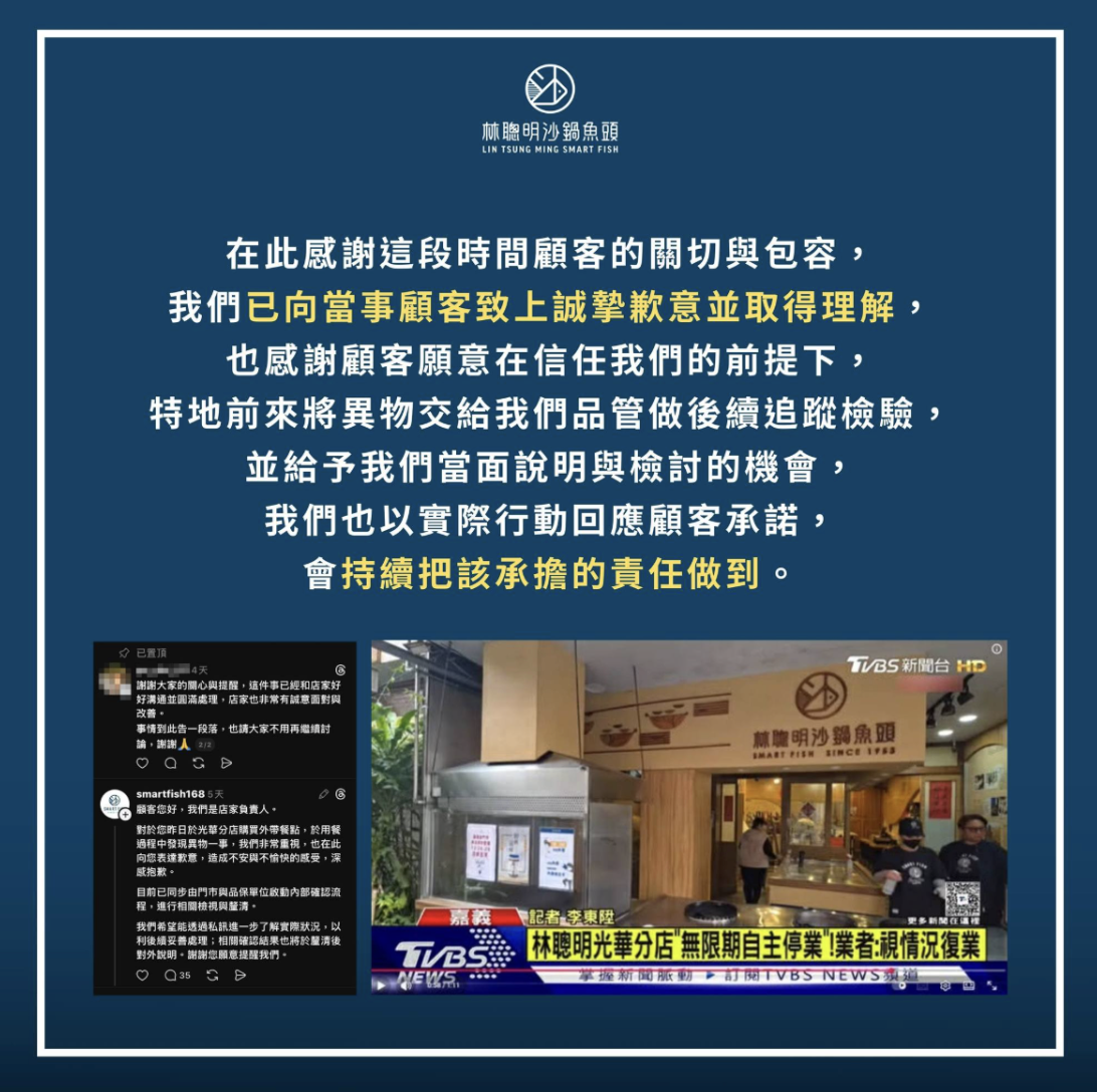 在這次事件中,我們誠摯感謝當事者顧客的理解與包容,並予以信任願意將異物交給我們,讓品保相關部門可後續追蹤檢驗;在此也謝謝當事顧客事後在社群平台留言,說明已圓滿處理此次事件,讓我們有機會向顧客當面溝通與負責;嘉義兩家門市也從一開始為期兩天的自主休業調整,延長為休業一週檢視,其中光華門市更決定無限期停業進行全店整頓,這是我們反省思考後,聰明團隊認為必須為廣大的顧客做出的正確決定,也讓團隊能持續進行流程調整與食品安全相關教育訓練,把該檢視的事情,能好好一項項重新檢討與規劃。