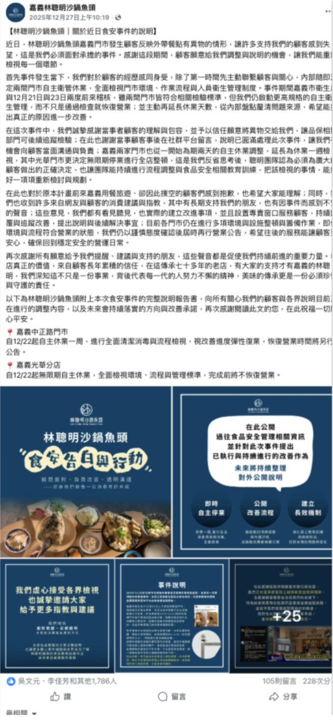 前情提要,2025 年 12 月 20 日消費者在社群平台發文表示,他在嘉義知名老店林聰明沙鍋魚頭外帶湯品回家,食用過程中發現有一隻蟑螂泡在湯裡,照片與描述迅速在網路上發酵,引起大量討論。